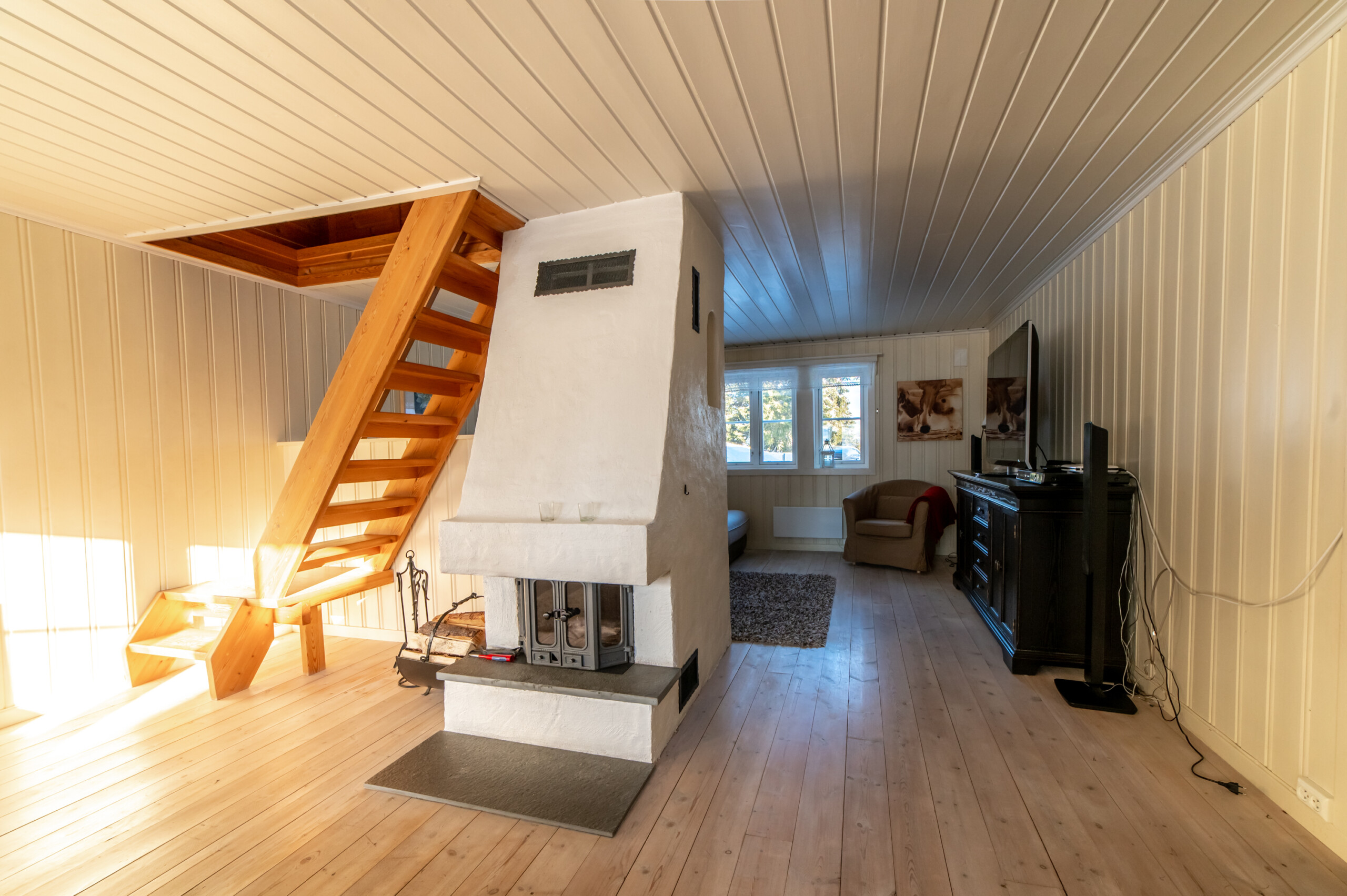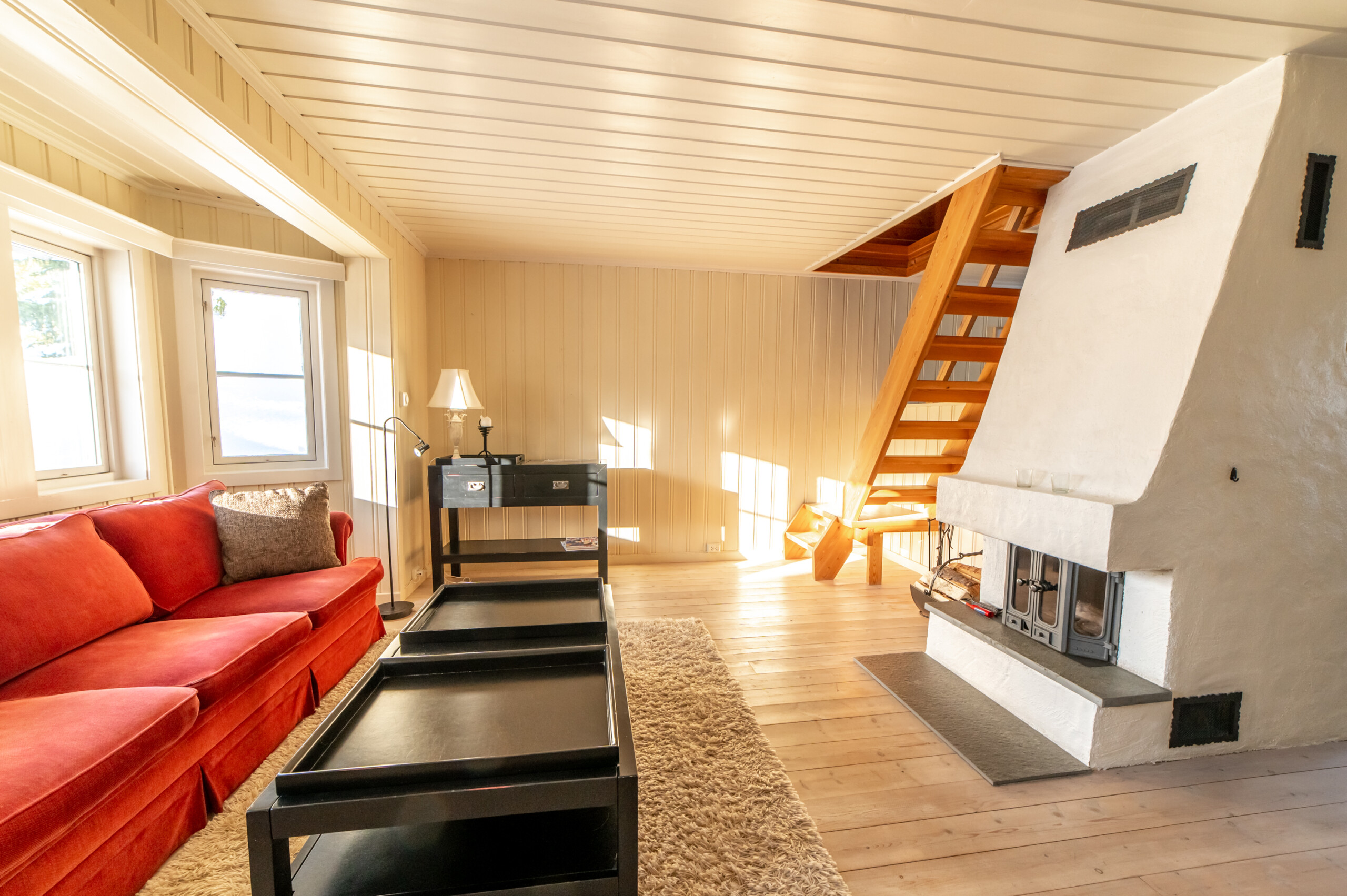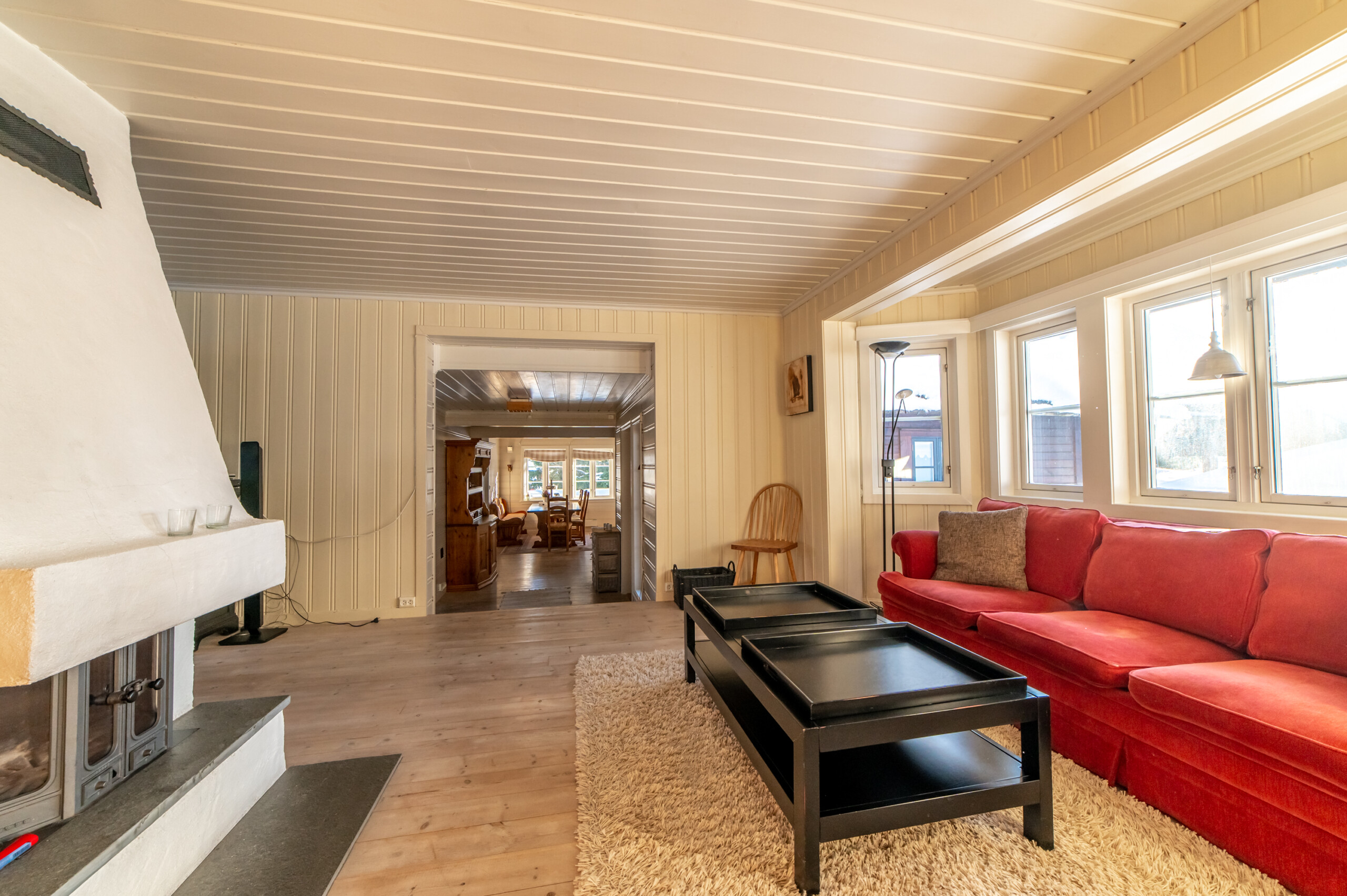Romslig todelt stue med to sittegrupper og peis i 1. etasje, og åpen løsning mot spisestue og kjøkken.