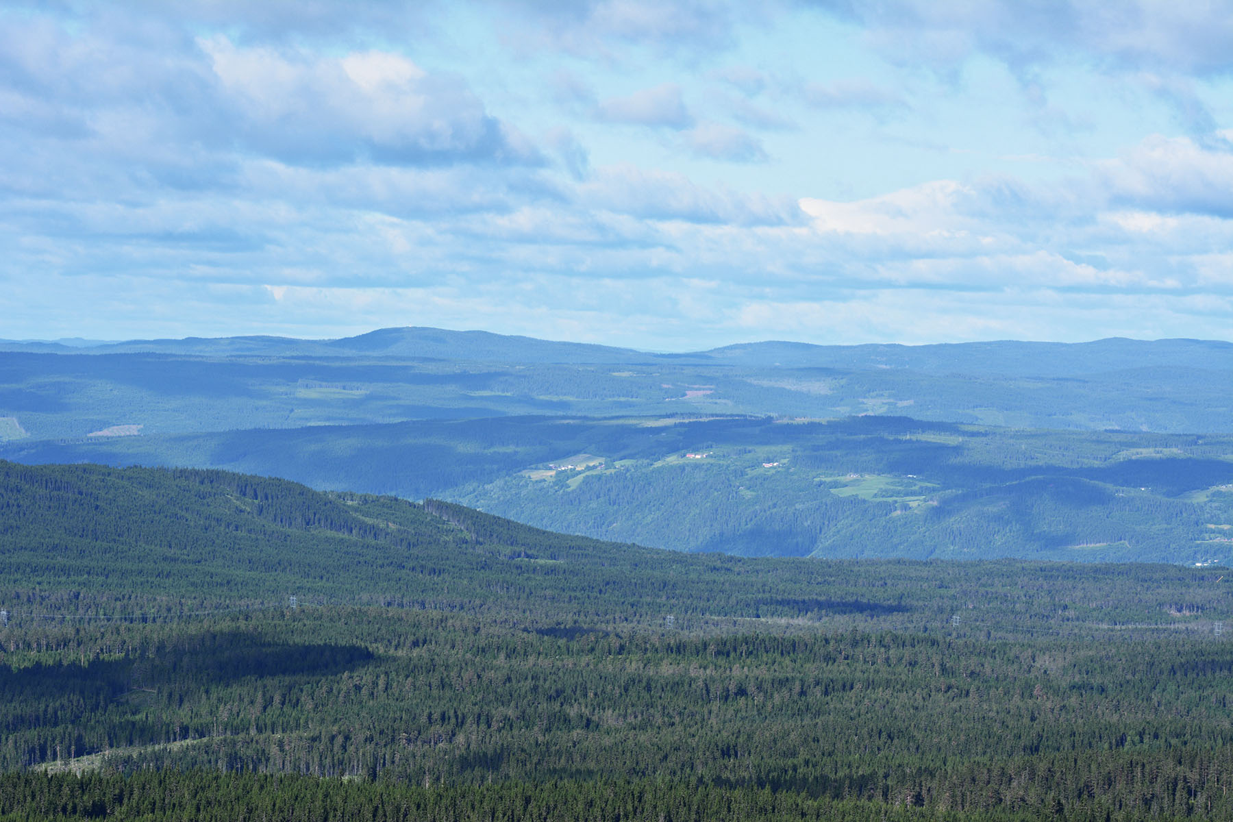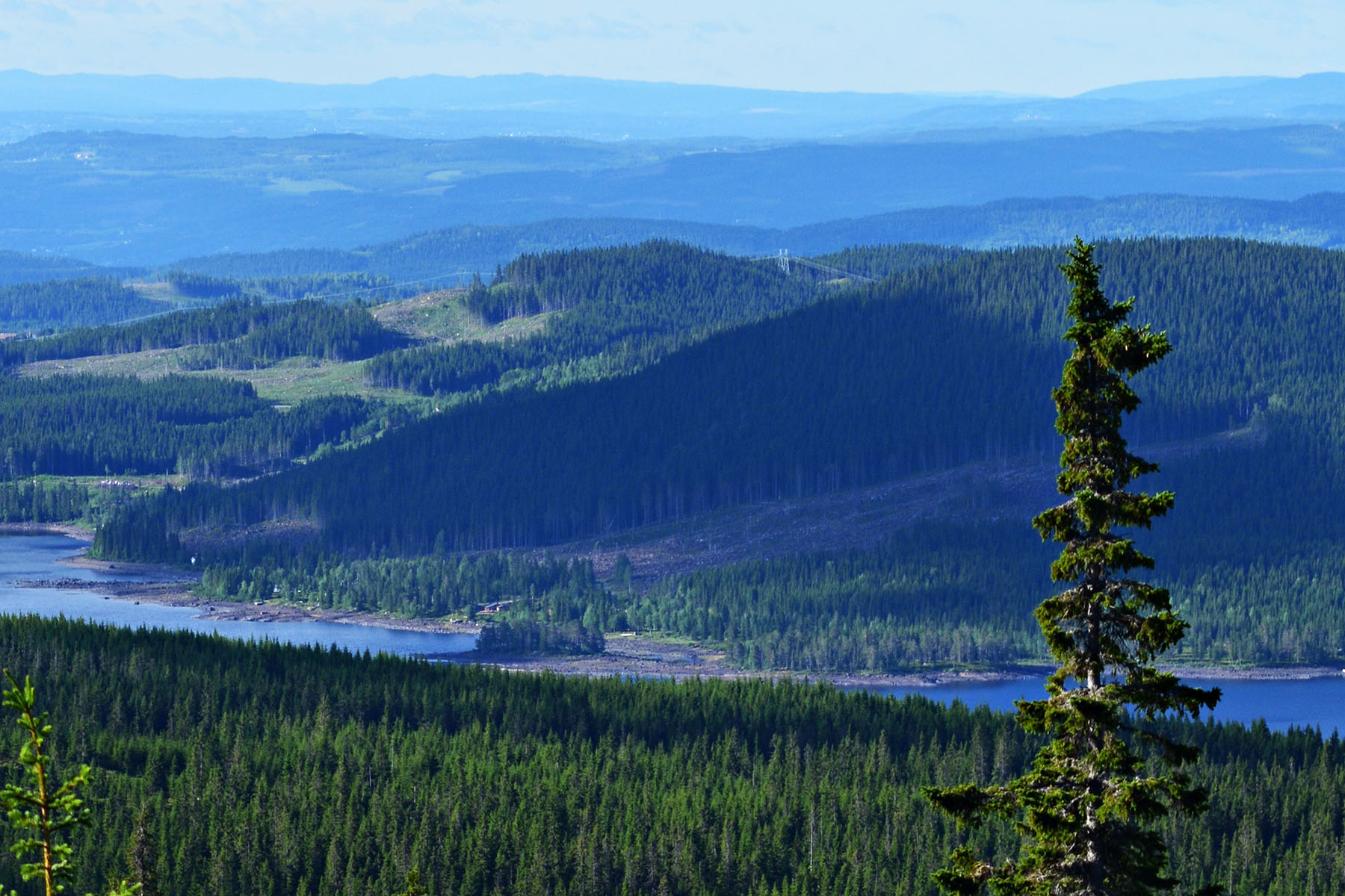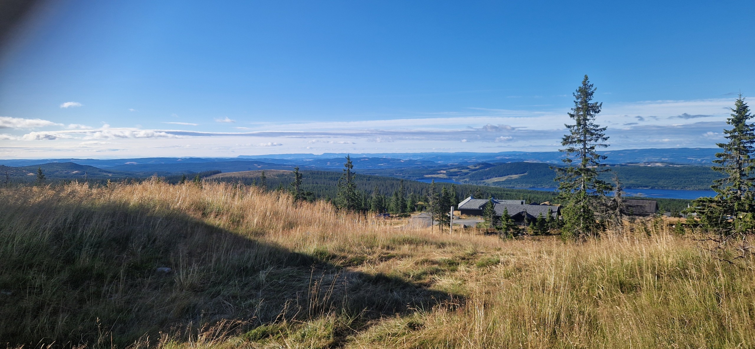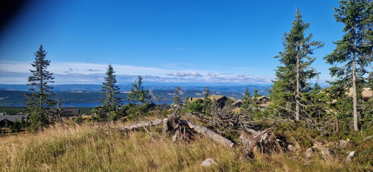 Utsikt fra hyttetomtene til omkringliggende fjell, Hedmarksvidda og flere vannspeil i dalbunnen gir en unik og sjelden opplevelse her på Sjusjøen.